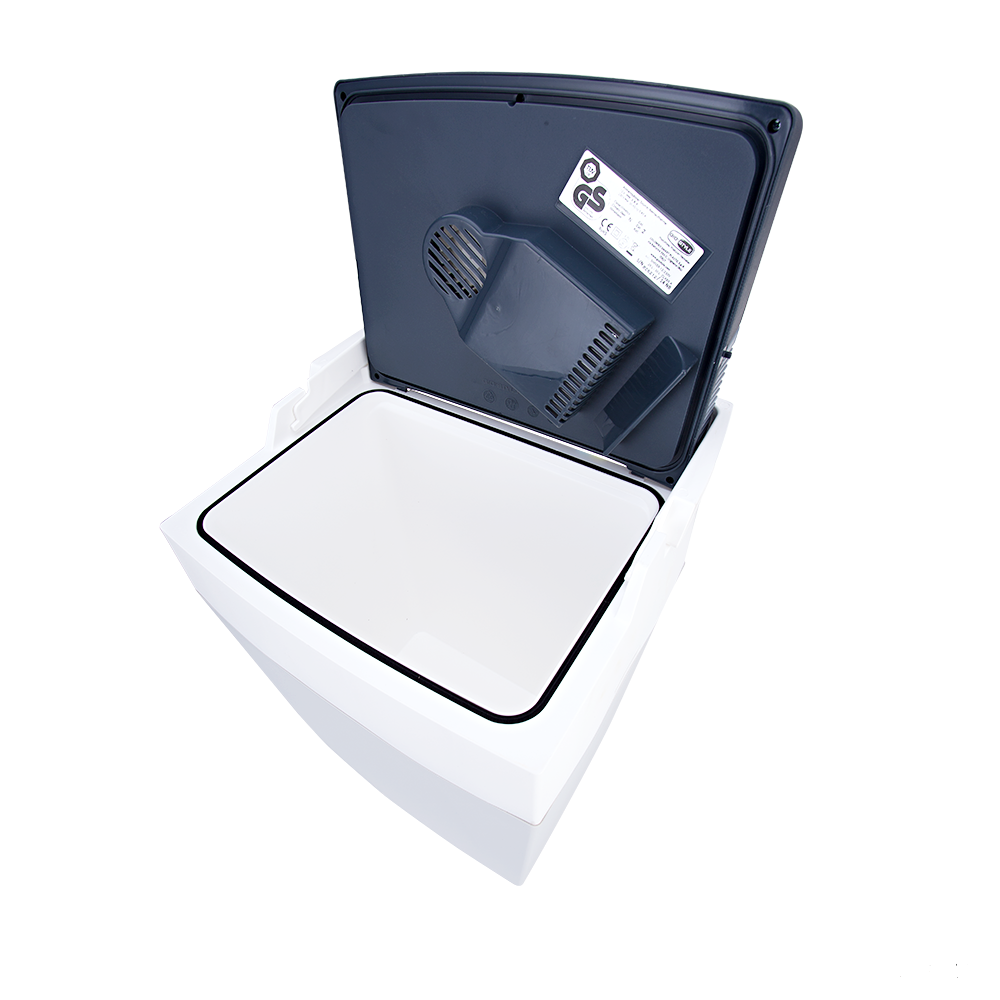 Холодильник питается либо от прикуривателя автомобиля, либо подключается к 230 В. Высокая герметичность обеспечивается резиновой прокладкой в крышке. Вертикально размещается две 2-литровые пластиковые бутылки или 38 шт * ж/б банка 0,33 л.