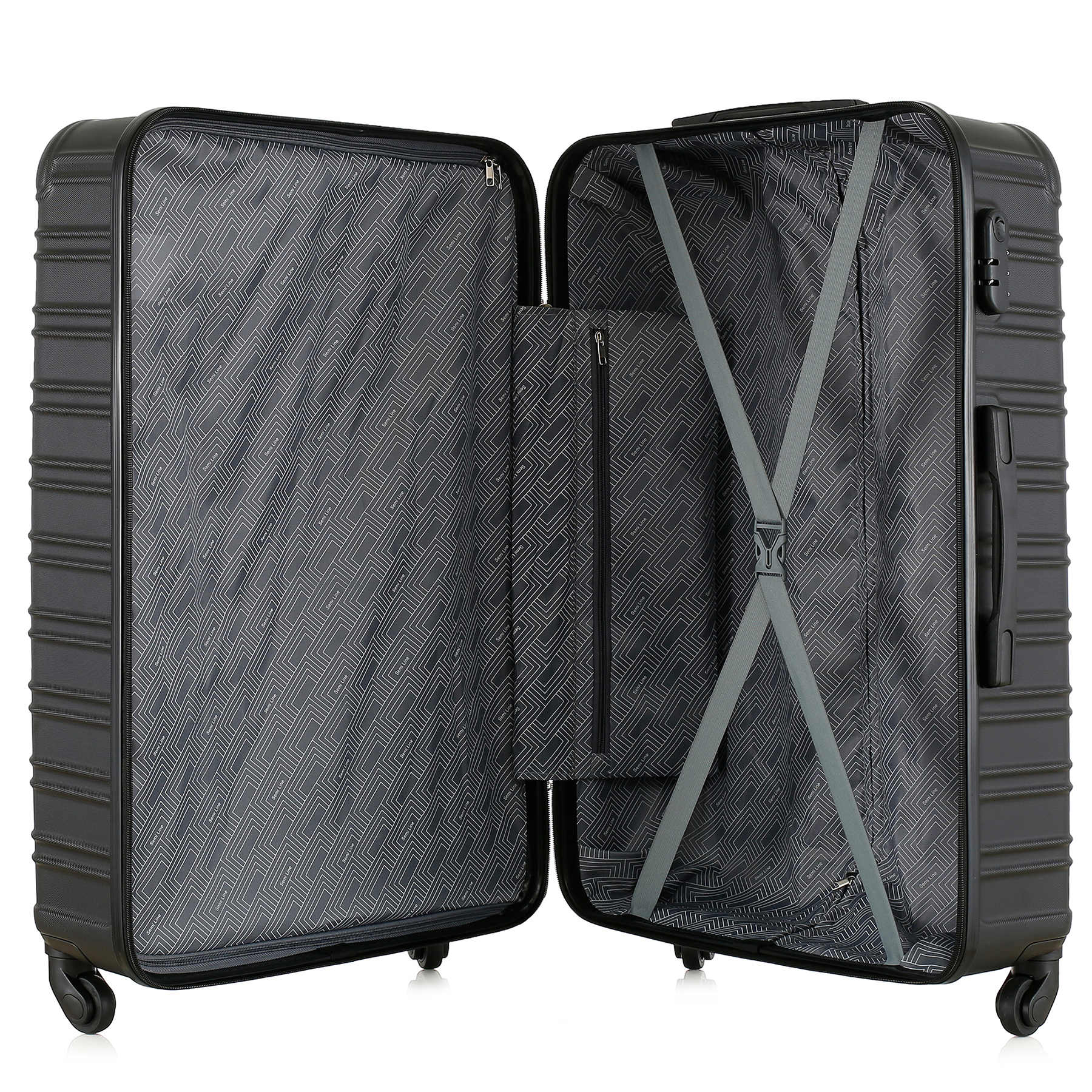 - Чемодан имеет текстильную перегородку на молнии, которая разделяет внутреннее пространство на два основных отделения.