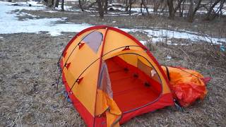 Всесезонная антиштормовая палатка Marmot Thor 2P – это классика для путешествий в жестких метеорологических обстоятельствах и альпинизма. В модели есть много жилой площади и пара тамбуров: один можно использовать для обустройства в нем полевой кухни. Конструкция Marmot Thor 2P была протестирована в аэродинамической трубе, но вмести с этим, она является представителем средней весовой категории. Палатка довольно просто устанавливается. Специально разработанная система оттяжек и коленообразные дуги с дополнительным уровнем усиления, обещают устойчивость во время различных явлений погоды. На той же высоте, что и пол и на входе в укрытие предусмотрены отверстия для вентиляции, позволяющие корректировать температуру в середине палатки. Это полностью влагонепроницаемая модель. Подобного свойства удалось достичь благодаря наличию ваннообразного дна с герметическими швами, которые подняты над землей. Амуниция от компании Marmot всегда могла похвастаться своим высочайшим качеством, а современная серия туристических и экспедиционных палаток стала безукоризненным тому доказательством.
