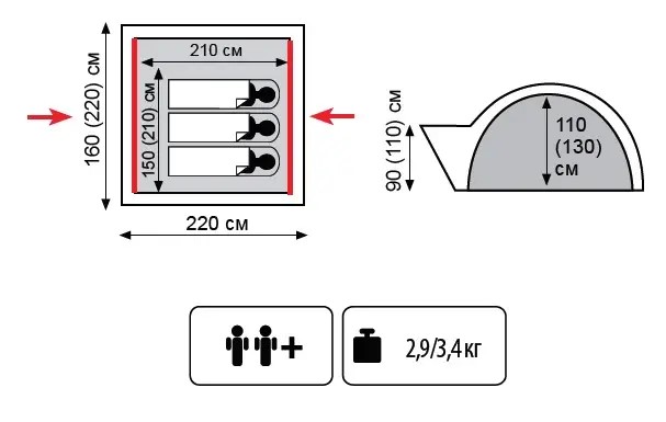 - Тент: 100% полиэстер 75D/190T WR PU 4000 мм в. ст.