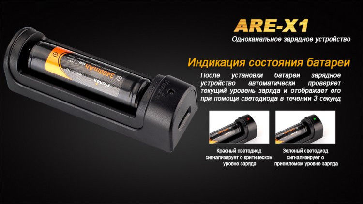 Отслеживать, какие именно функции активны в данный момент, помогает индикатор со светодиодной подсветкой. Когда он светится красным, продолжается процесс зарядки аккумулятора. Переключение индикатора на зеленый свет говорит о том, что аккумулятор полностью заряжен. Если использовать Fenix ARE-X1 в качестве power bank, то индикатор будет мигать красным цветом и погаснет, когда зарядка будет окончена. Чтобы воспользоваться функцией power bank, зарядное устройство с аккумулятором следует подключить к прибору, который вы хотите зарядить, посредством кабеля с разъемом USB.