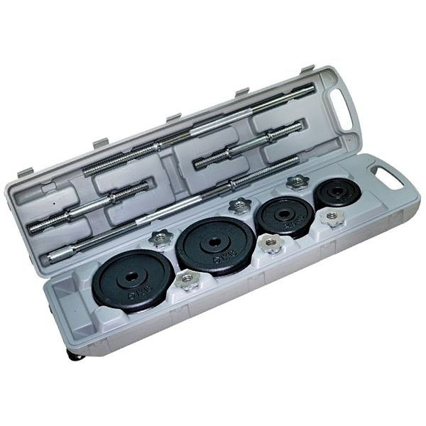 Новинка от фирмы Stein (DB4033-50) пара разборных гантелей в кейсе, а так же прямой гриф для штанги. Общий вес данного набора ― 50кг. Материал изотовления блинов ― чугун с порошковой покраской, стойкой к ударам и сколам. Гантельные рукоятки и гриф для штанги ― хромированные.