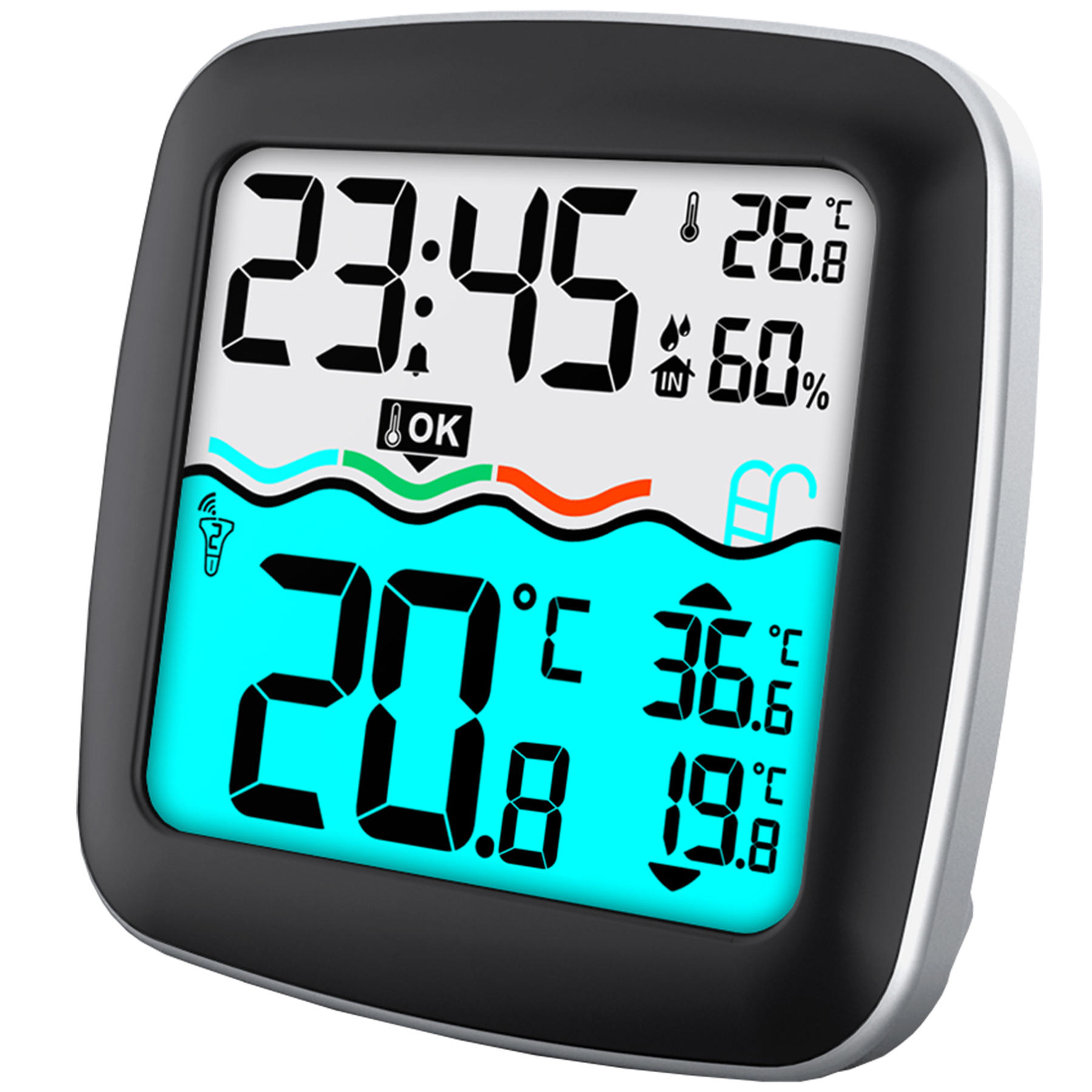 Теперь вы можете следить не только за микроклиматом в SPA зоне, но и контролировать температуру воды в нескольких водных зонах одновременно. Technoline WS9059 – это термогигрометр, который измеряет температуру воды в бассейне и может поддерживать до 3-х беспроводных датчиков одновременно. Датчик водонепроницаем и оборудован собственным экраном для добывания температуры воды. Он может передавать данные на расстояние до 60 метров радиосигналом на основной блок, установленный в помещении. При этом основной блок также измеряет внутреннюю температуру, влажность и показывает минимальные и максимальные значения этих параметров и дополнительно оборудован часами с будильником.