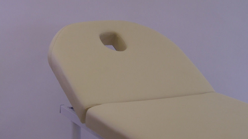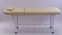Простая и удобная кушетка СН-266А имеет подъёмную 2-ю секцию с вырезом для лица. Вырез по необходимости закрывается подушечкой. Ножки кушетки металлические. Для удобства хранения аксессуаров под кушеткой предусмотрена полочка для хранения.