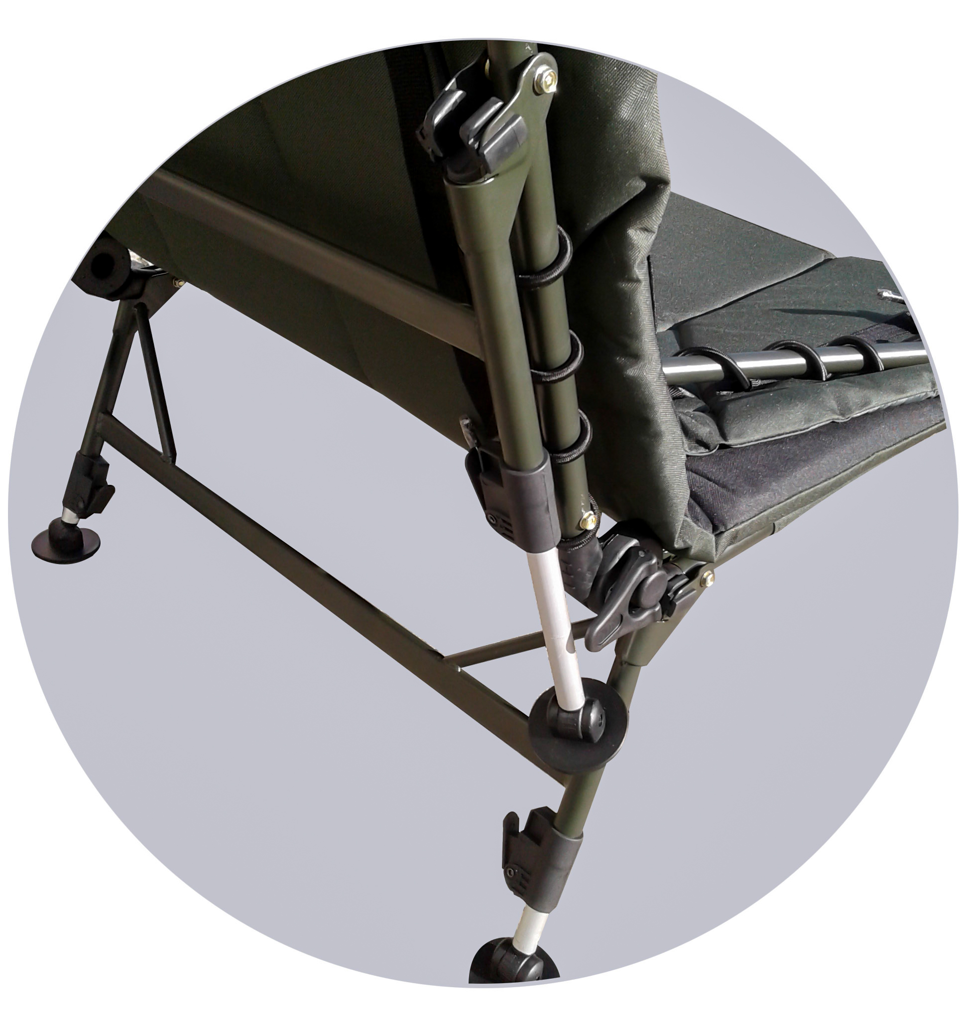 Раскладушка – это полноценная кровать в походных условиях. Её можно установить в горизонтальном положении на неровной поверхности, подстроив каждую из шести ножек в отдельности, регулируется наклон спинки. Высота может варьироваться от 31 до 45 см. Мощная конструкция карповой раскладушки рассчитана на вес до 160 кг. Длина кровати 208, ширина 82 сантиметра.