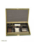 Универсальный набор для чистки оружия, гладкоствольного и нарезного, ружей и пистолетов. Упаковано в деревянную коробку из крашеного в зеленый цвет дерева. Внутри мягкая полимерная укладка с ячейками для содержимого. Закрывается на латунный замочек. Отличный подарок для владельца коллекции оружия.