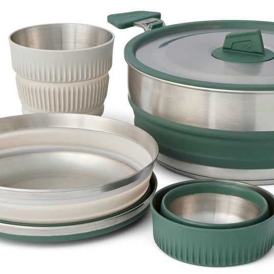 Прочный и компактный набор для приготовления пищи Detour Stainless Steel One Pot предлагает обед на двоих. Он включает в себя жаропрочную кастрюлю Detour объемом 3 л с двойными ручками для идеального наливания, а также большие миски и кружки для двух человек.