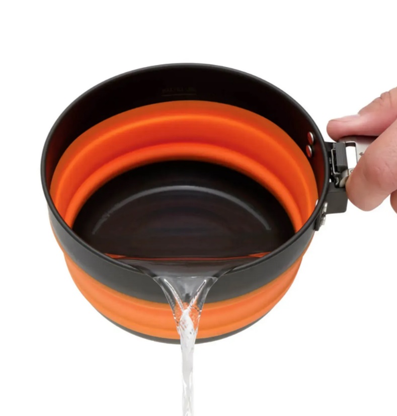 Кастрюля имеет твердое анодированное алюминиевое дно для эффективной теплопередачи и быстрого закипания, а боковые стенки из пищевого силикона позволяют складываться для удобства упаковки. Набор идеально подходит для тех, кто ставит во главу угла вес и пространство, отправляясь в одиночные походы.