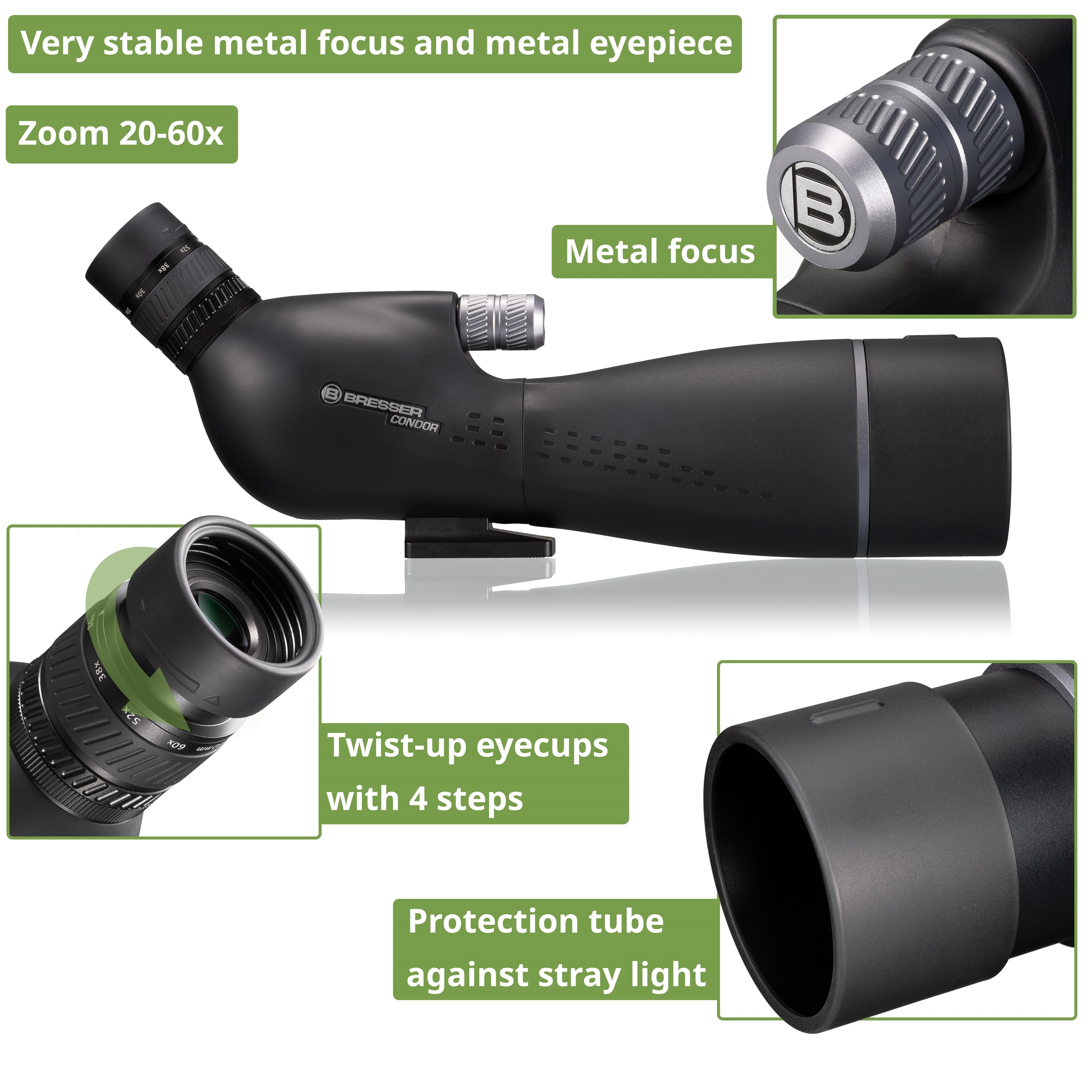 Подзорная труба Bresser Condor 20-60x80/45 Gen.II WP подойдет для наблюдениями за природой, спортивными мероприятиями, спортивной стрельбой или на охоте. Преимуществом подзорной трубы Bresser Condor 20-60x80/45 Gen.II WP является большой диаметр объектива и широкий диапазон увеличения. Благодаря большой апертуре основной линзы 80 мм, этот инструмент идеально подходит для наблюдения в условиях низкой освещенности. Он собирает на 44% больше света, чем устройство с таким же увеличением и апертурой основной линзы в 60 мм. Любители цифровой фотографии найдут в серии Condor надежный инструмент для качественных фотографий. Все линзы этой модели имеют полеое многослойное просветляющее покрытие, а призма изготовлена из высококачественного оптического стекла BAK4. Именно благодаря всем этим характеристикам и удаётся достичь очень чёткого и равномерно яркого изображения. Труба полностью защищена от проникновения влаги. При создании Bresser Condor 20-60x80/45 Gen.II WP большое внимание уделялось использованию высококачественных материалов. В этой серии уже есть прочное металлическое колесо фокусировки, с помощью которого можно точно и плавно настроить резкость. Утолщенное резиновое покрытие корпуса надежно защищает прибор от повреждений и обеспечивает надежный захват подзорной трубы рукой. Для максимального комфорта наблюдения окуляр установлен под углом 45º. Фокусировка решена в виде маховичка небольшого диаметра, расположенного в центральном положении, что удобно для использования, независимо от того какой рукой проводить фокусировку. Для большего комфорта наблюдений применен поворотно-выдвижной наглазник. Выдвижная бленда обеспечивает надежную защиту и от солнечных бликов и от осадков. Крышки объектива и окуляра надежно фиксируются на своих местах и точно не потеряются во время движения. Для удобства транспортировки и хранения в комплекте предусмотрен полевой нейлоновый чехол и нашейный ремень. Конструкция чехла позволяет полноценно пользоваться трубой не снимая его.