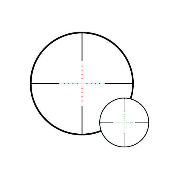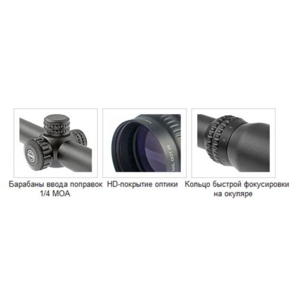 - Подсветка прицельной сетки: красная/зеленая, регулируемая, по 5 уровней яркости для каждого цвета
