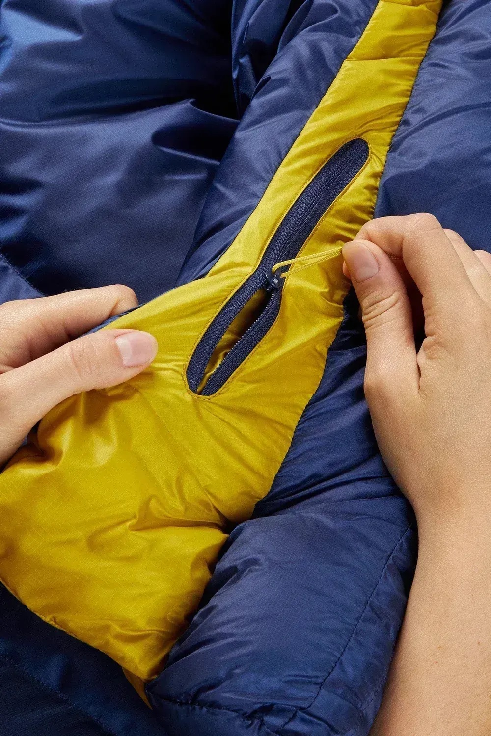 Благодаря подложке из переработанного нейлона и внешнему материалу Pertex® Quantum, он устойчив к ветру и менее вреден для окружающей среды. Пух также обработан гидрофобной обработкой Nikwax, не содержащей фторуглерода, для предотвращения образования конденсата. Он имеет застежку-молнию длиной ¾ с защитными накладками, внутренний карман на молнии и водонепроницаемый компрессионный мешок с рулоном для удобного хранения.