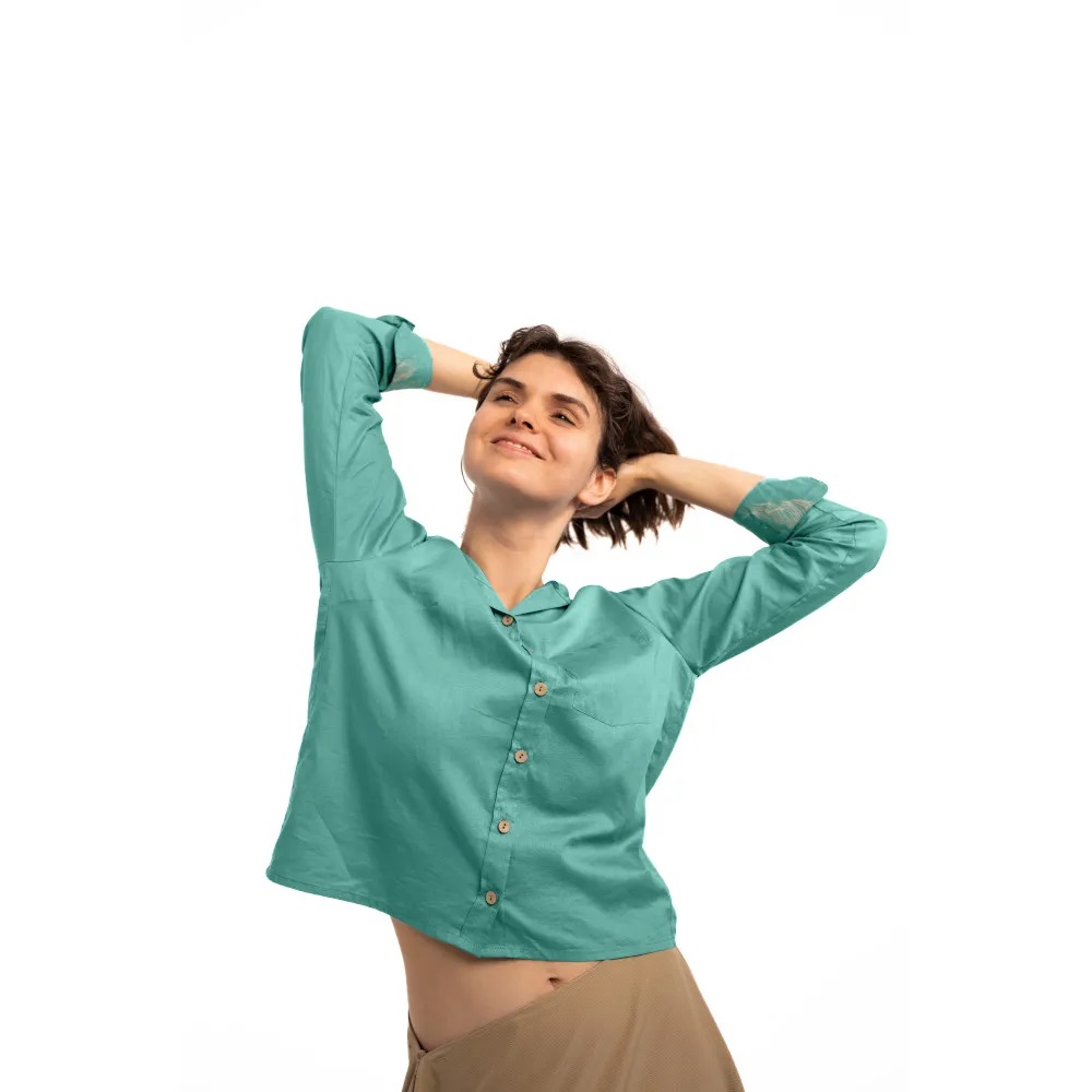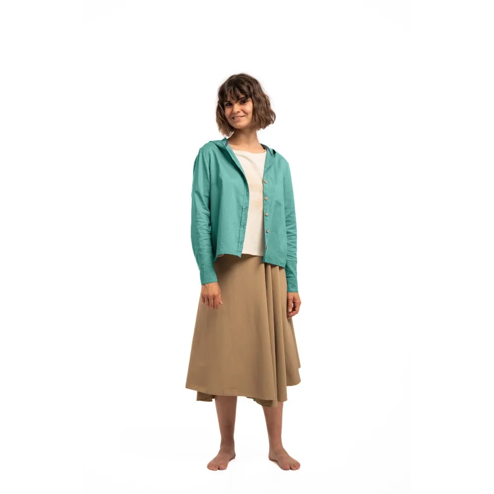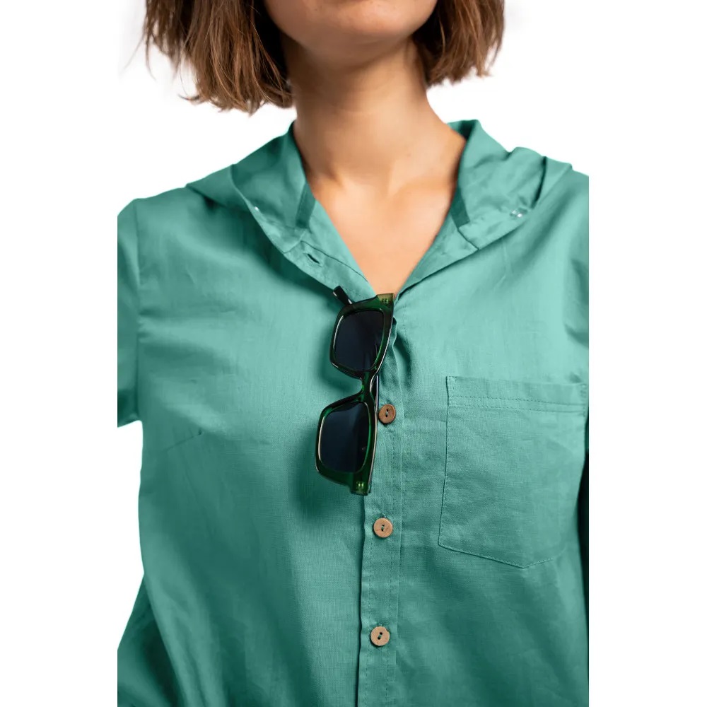 Свободный, широкий крой и экологичный состав (органический хлопок, конопля и переработанный нейлон) обеспечивают максимальную воздухопроницаемость. У рубашки капюшон от солнца и украшен орнаментом на рукавах «Оберег путешественницы» от Натальи Ревонюк, созданным в рамках этой коллекции.