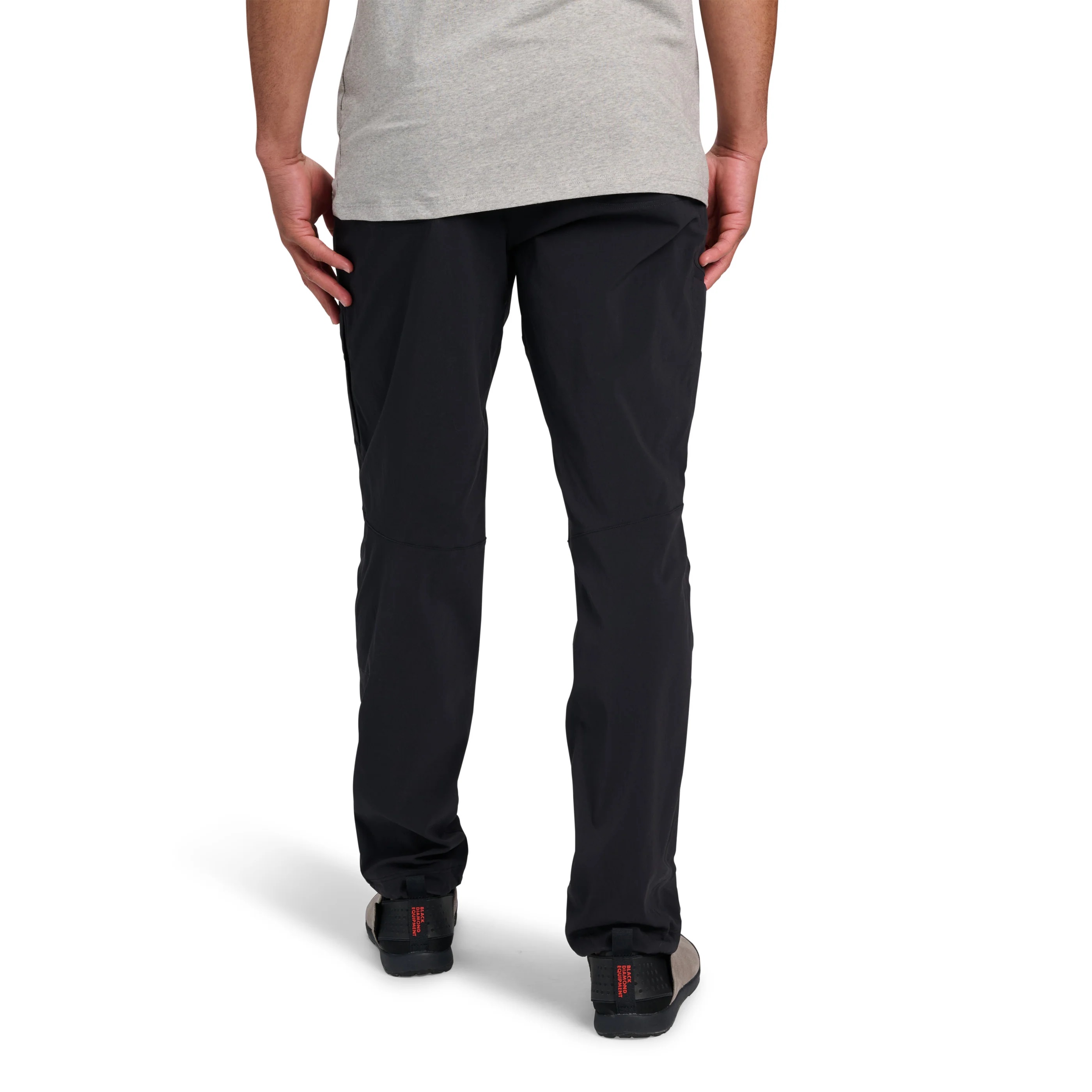 Конструкция с клином в шве и анатомическими коленями обеспечивает комфорт при высоких шагах и подъемах на скале. Регулируемый низ штанин позволяет адаптировать штаны под велосипед или скалолазание. Простой прямой крой дополняют два передних кармана, два задних, а также скрытый карман на молнии на бедре для телефона или закусок.