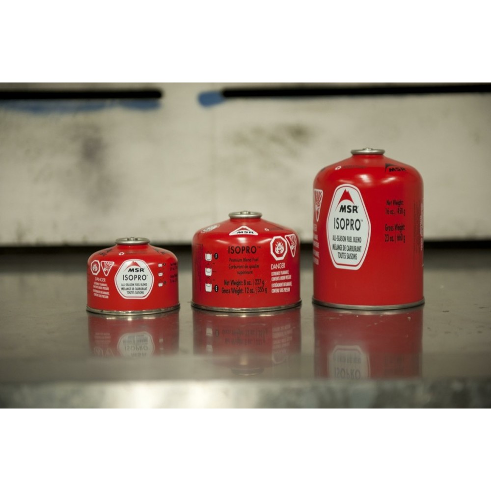 - Газовые картриджи MSR® IsoPro™ выпускаются в трех размерах: 4, 8, и 16 унций (110, 227 и 450г). Совместимы с любыми горелками резьбового стандарта. 110-граммовый картридж помещается внутрь котелка Reactor® 1L.