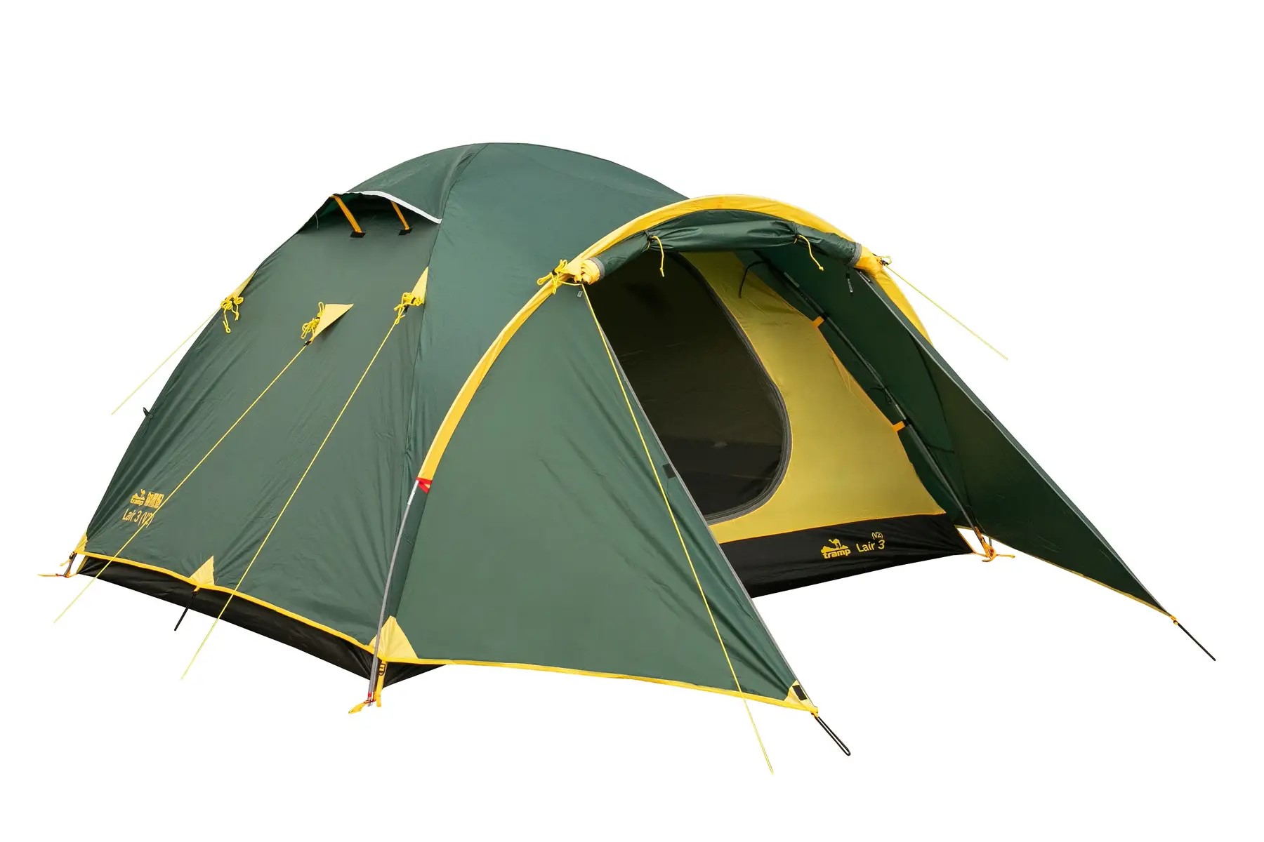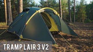 Обновленная версия универсальной туристической трехместной палатки Tramp LAIR 3 (V2). Трехдуговая модель конструкции "полусфера" с просторным тамбуром и двум входами.