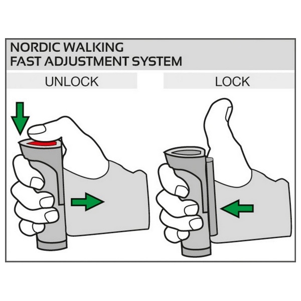 Nordic walking fast adjustment system - система моментального отсоединения ремня от рукоятки палки. Преимущество данной системы состоит в том, что для отсоединения ремня не нужно использовать вторую руку - достаточно нажатия большого пальца руки на специальную кнопку, расположенную в торце рукоятки. Важно, что зажим полностью надежен и не может быть отстегнут случайным образом во время ходьбы. Такая система очень удобна, когда палку заклинило между камней, на руку надета толстая зимняя перчатка или просто нет возможности другим способом освободить руку от палки.