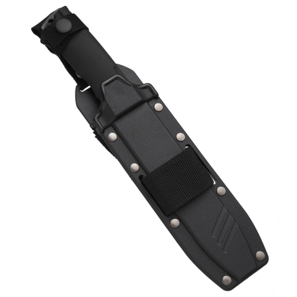 Рукоять ножа выполнена из синтетического материала – эластомера, что обеспечивает надежный хват в сложных условиях и позволяет ножу отлично ложиться в руку, обеспечивая комфорт и безопасность при работе. В комплекте с ножом имеется надежный чехол из термопластика с креплением к поясу, обеспечивающие безопасное и удобное ношение ножа и транспортировку.