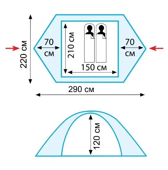- Тент: 100% Полиэстер 75D/190T RipStop 6000 мм в. ст.