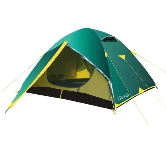 Универсальная двухместная туристичсекая палатка Tramp NISHE 2 (V2) с двумя входами, двумя тамбурами увеличеного объема и площади. Дополнительная консольная дуга увеличивает площадь и внутренний объем тамбура, повышает ветроустойчивость и ветрообтекаемость палатки.