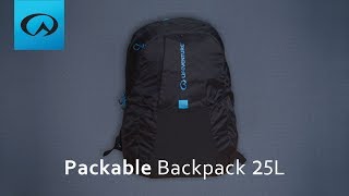 Lifeventure Packable 25 – ідеальний легкий рюкзак для повсякденного використання, походів на навчання або за покупками, а також для подорожей. Упаковується у вбудовану кишеню на блискавці, займає мінімум місця в основному багажі або дорожній сумці, і легко перетворюється на повноцінний рюкзак за потреби. Виготовлений з легкого та міцного нейлонового рипстопа з поліетиленовим покриттям, що відштовхує вологу та запобігає намоканню під час легкого дощу. Основне відділення об'ємом 25 літрів на двосторонній блискавці, дві додаткові кишені на блискавці, дві зовнішні еластичні кишеньки для пляшок і зовнішня кишеня-муфта для одягу. Лямки виконані з комфортної, повітропроникної сітки 3D Air Mesh.