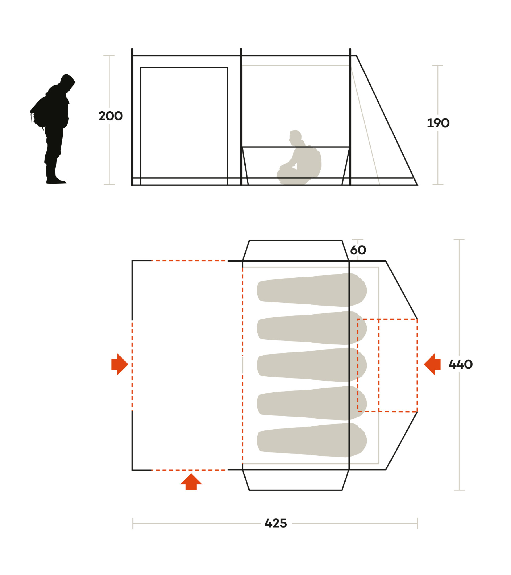 - Критий вхід забезпечує захищений вхід до вашого намету, що запобігає потраплянню дощу в житлову зону.