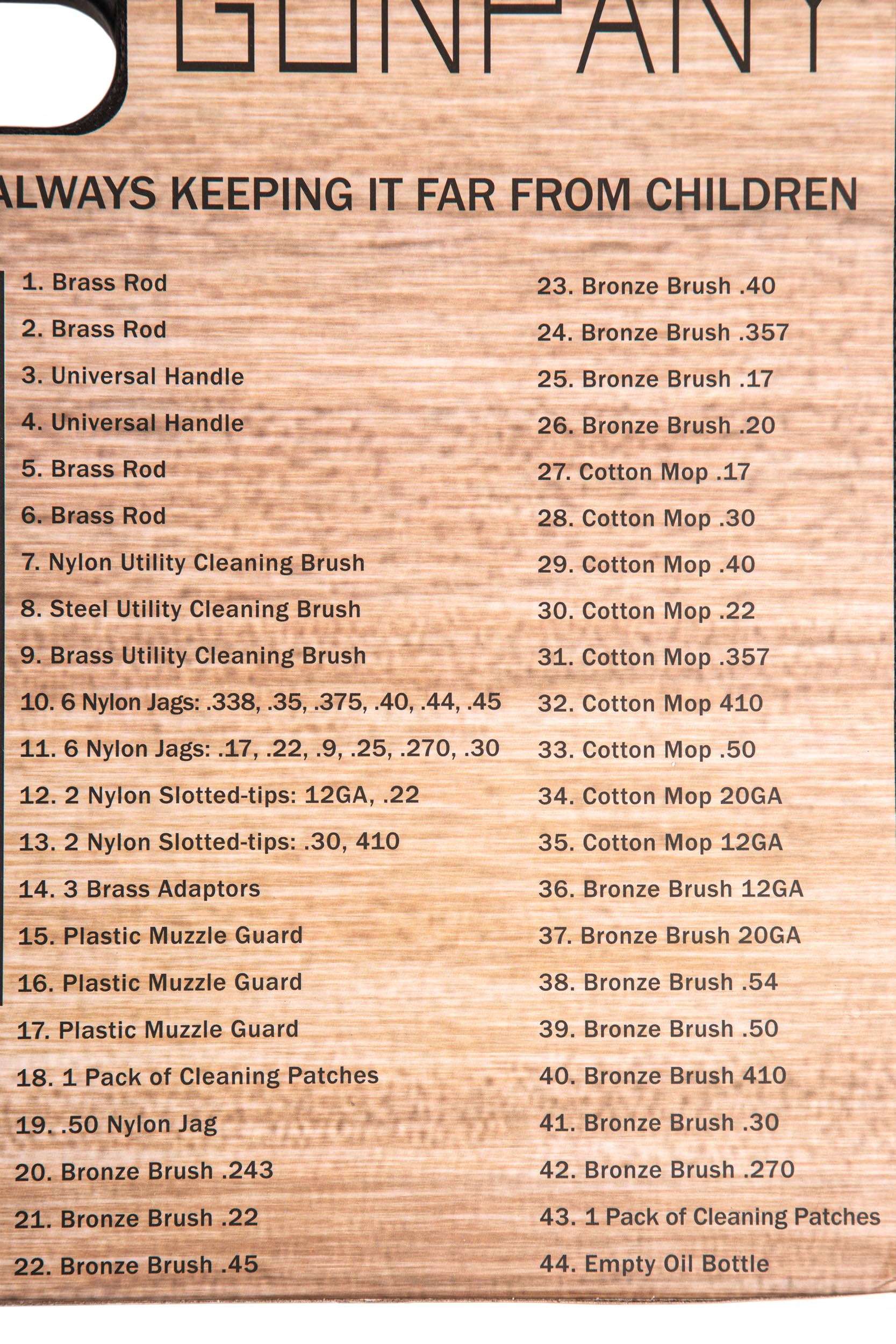 - Набір можна використовувати для чищення всіх типів рушниць, гвинтівок та пістолетів.