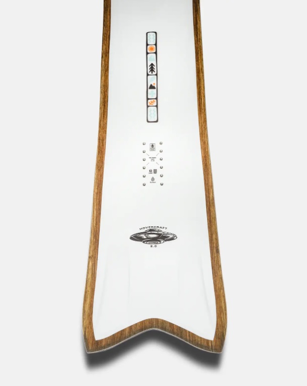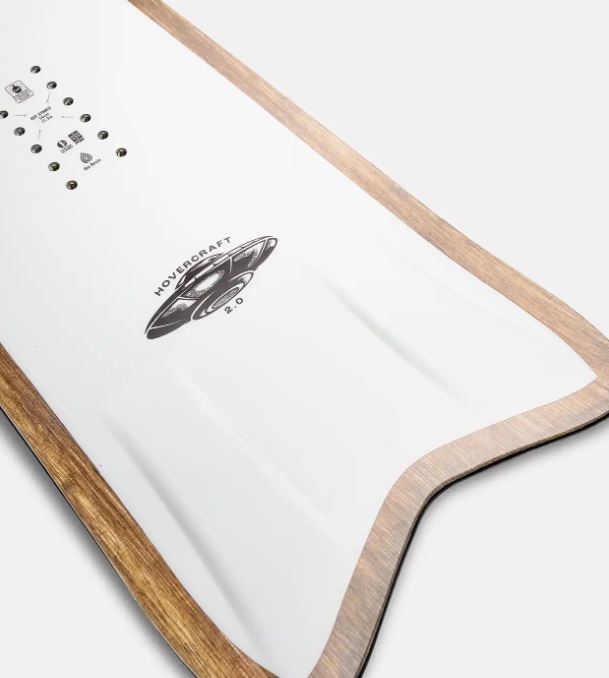 Hovercraft 2.0 - це вибухова альтернативна фрірайд-дошка із звуженою спрямованою формою, яка пропонує напрочуд різноманітні характеристики. Завдяки плаваючому носу, кемберу під ногами і довгому бічному вирізу, Hovercraft впевнено рухається пухлиною, кіркою або грунтом, а також ковзає по підготовлених трасах. Hovercraft також оснащений технологією Re-Up Tech та виготовлений із перероблених матеріалів, отриманих із старих сноубордів.
