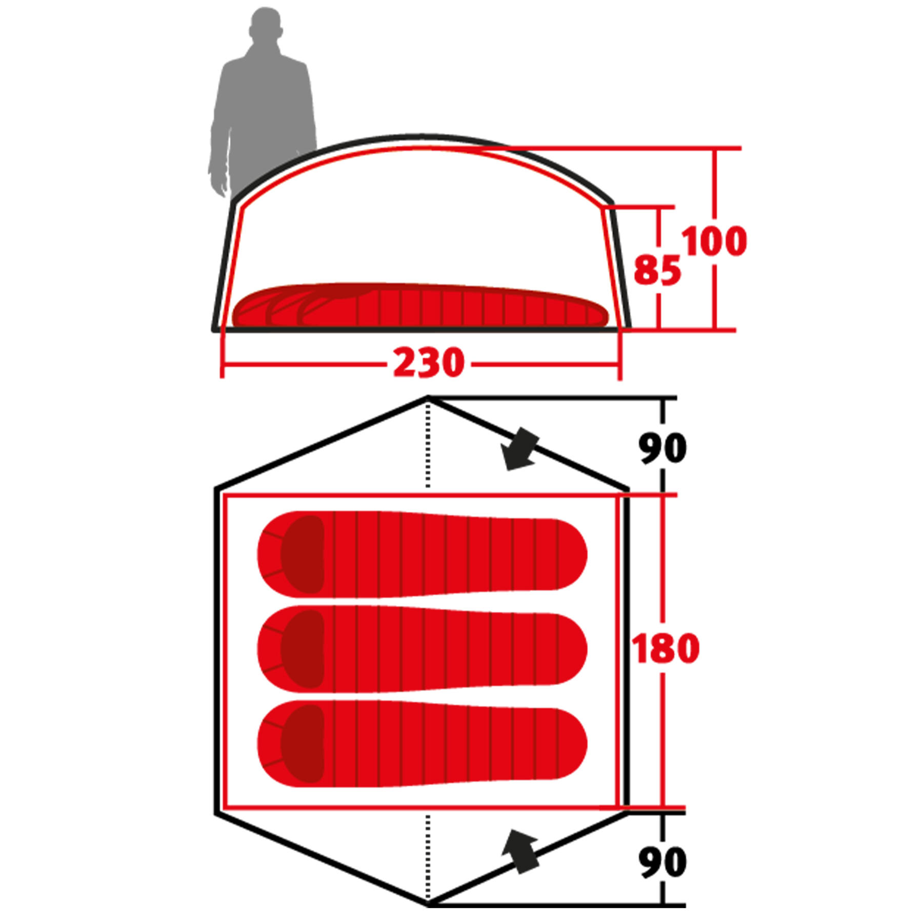 - Внутрішній намет (Д х Ш х В): 230 х 180 х 100 см