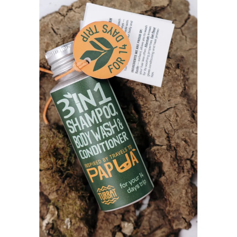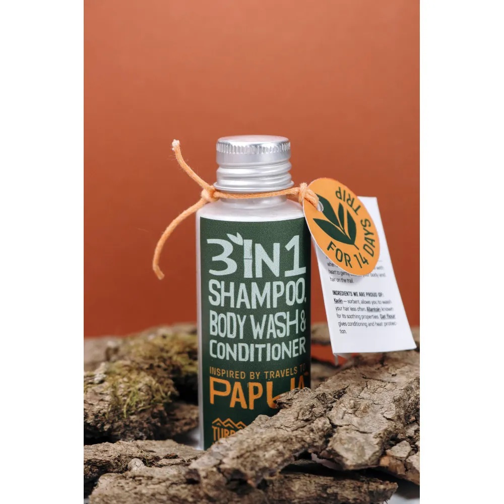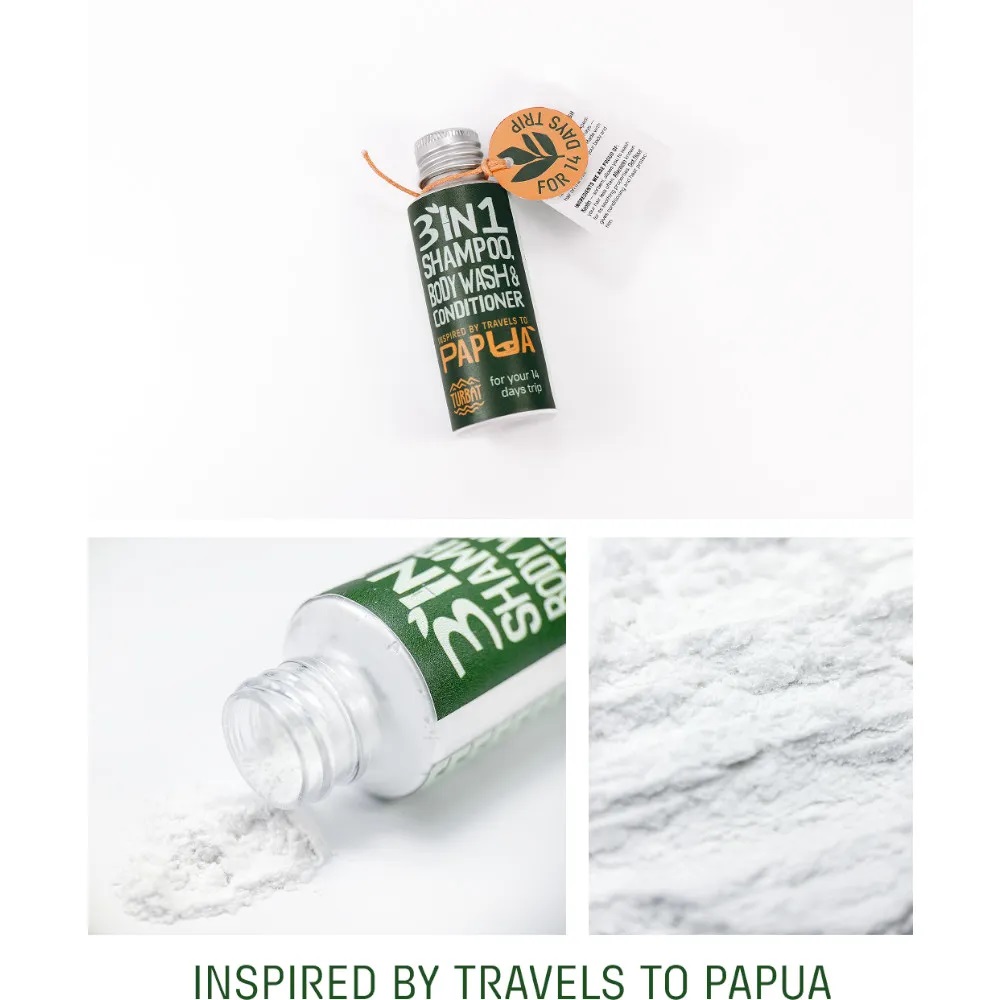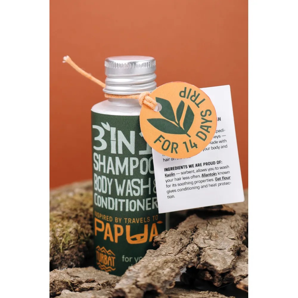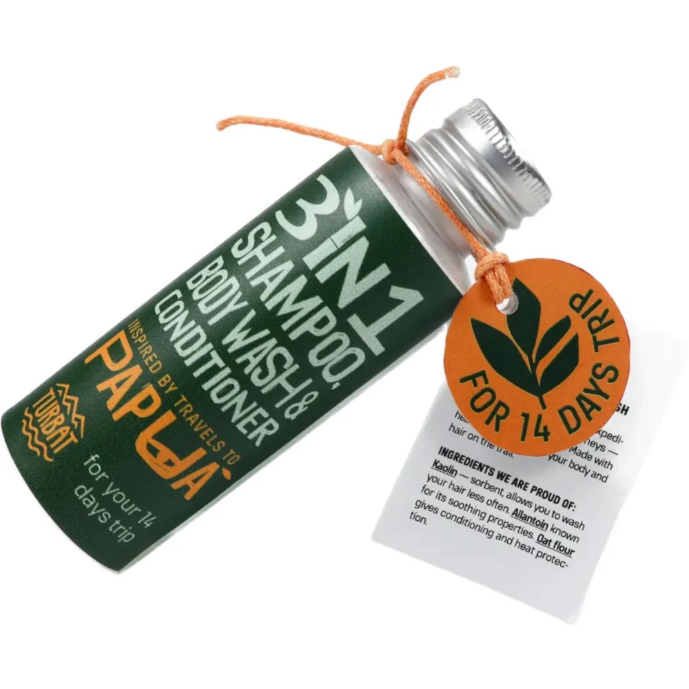 Сухий шампунь-мило-кондиціонер Turbat Papua – 3 в 1 шампунь-мило-кондиціонер створений для гір, експедицій та вільних мандрів, коли вага має значення, щоб ніжно очистити твоє тіло та волосся. Безводна формула економить вагу втричі: всього 30 грам cухого порошку на 14 днів подорожі! Усі компоненти повністю натурального походження.