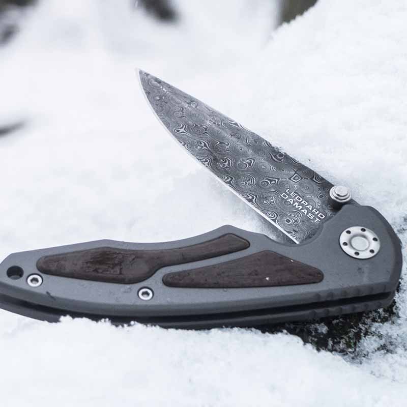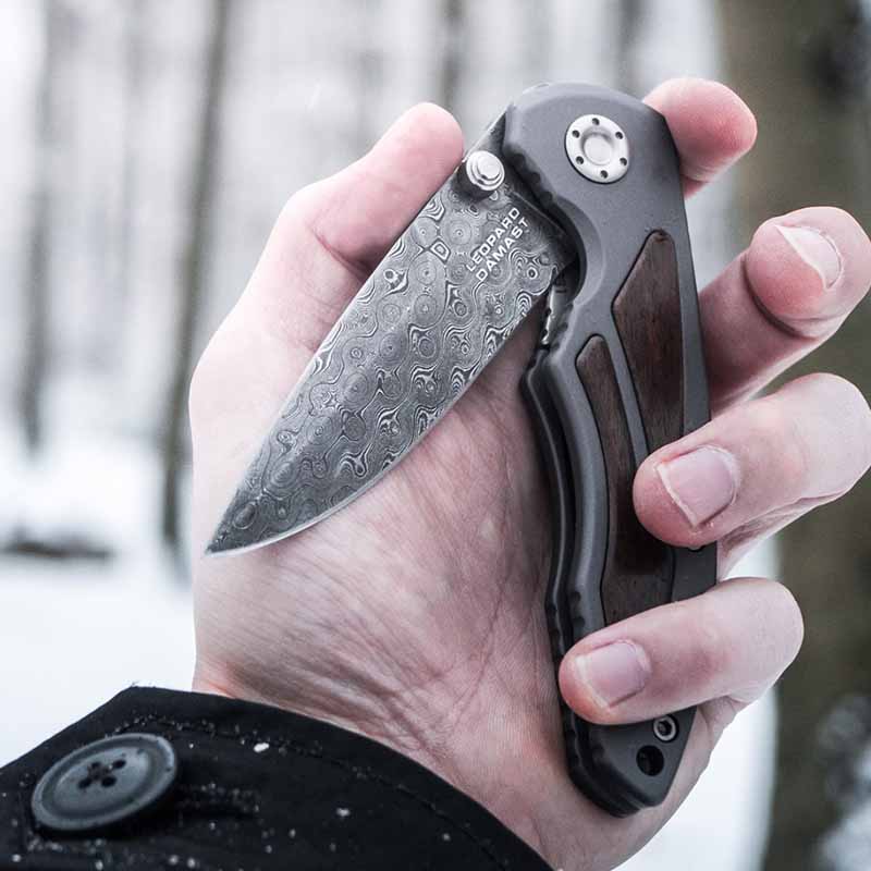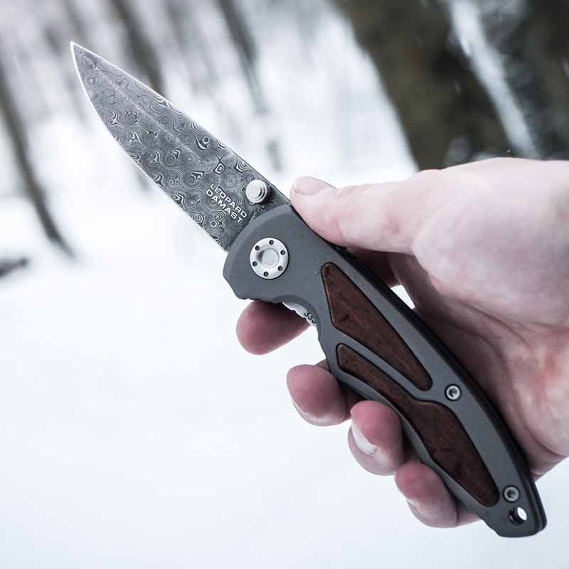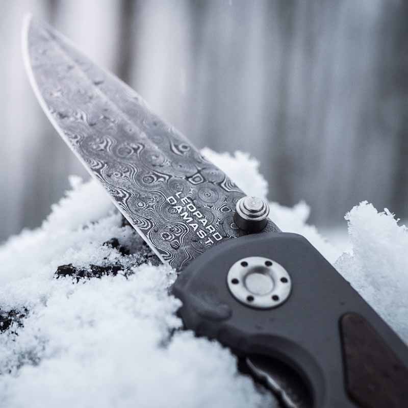 Складна версія ножа Boker Leopard-Damast I виконана з привабливої дамаської сталі, що має 320 шарів. Для кування використовувався метод Штемпельного дамаску. У результаті накладання стільки шарів сталі, на клинку вийшов красивий візерунок у вигляді “Маленьких пірамід”. Використана для виготовлення сталь, застосовувалася для виготовлення стволів зброї німецьких танків Leopard.