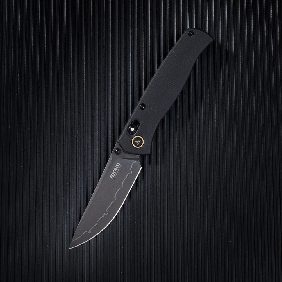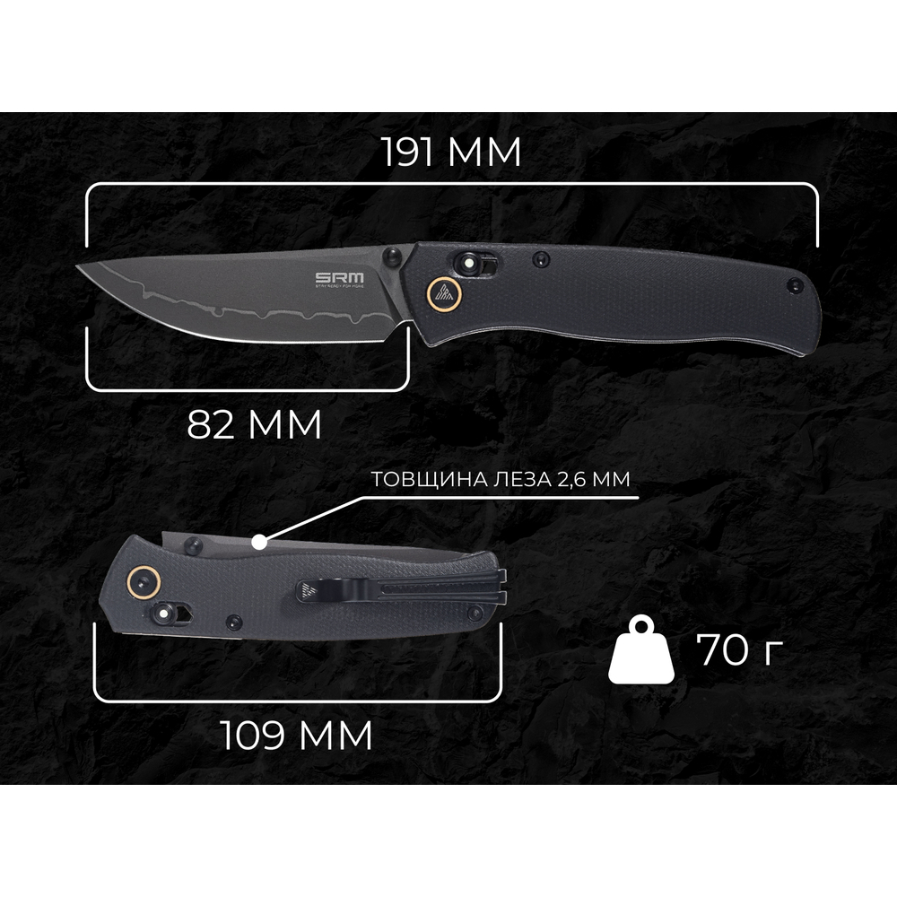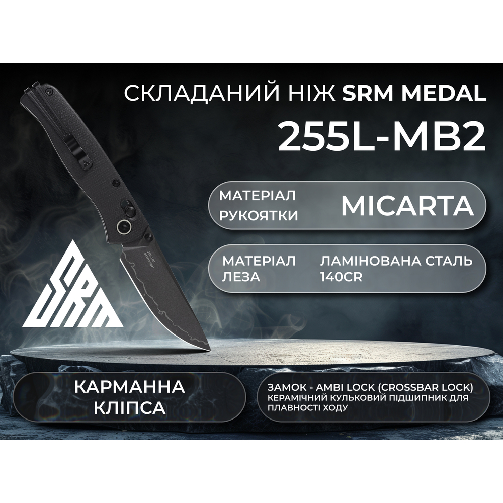 Надійний та якісний ніж складаний SRM Medal 255L-GK2 призначений для туризму, міста та походів. Ніж дуже зручний та безпечний для носіння в кишені, а також не займе багато місця у сумці чи рюкзаку. Ніж складається зі сталі 140Cr з ламінуванням двома шарами нержавіючої сталі та фінішною обробкою Bead Blast, а також із твердістю 61-63 HRC. Клинок відрізняється гарною стійкістю до корозії, легкістю заточування, міцністю. Рукоятка складається з мікарти, це багатошаровий композит із тканини та смоли. Він легкий, жорсткий і стійкий до вологи, перепадів температур та зношування. Шорстка поверхня дає «сухий» хват без ковзання.